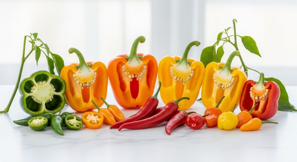 ピーマン、パプリカ、唐辛子はすべて、植物分類学上ナス科(Solanaceae)トウガラシ属(Capsicum)に属するCapsicum annuum L.という同一の種です。トマトやナス、ジャガイモと同じナス科に属しながら、トウガラシ属という独自のグループを形成しています。