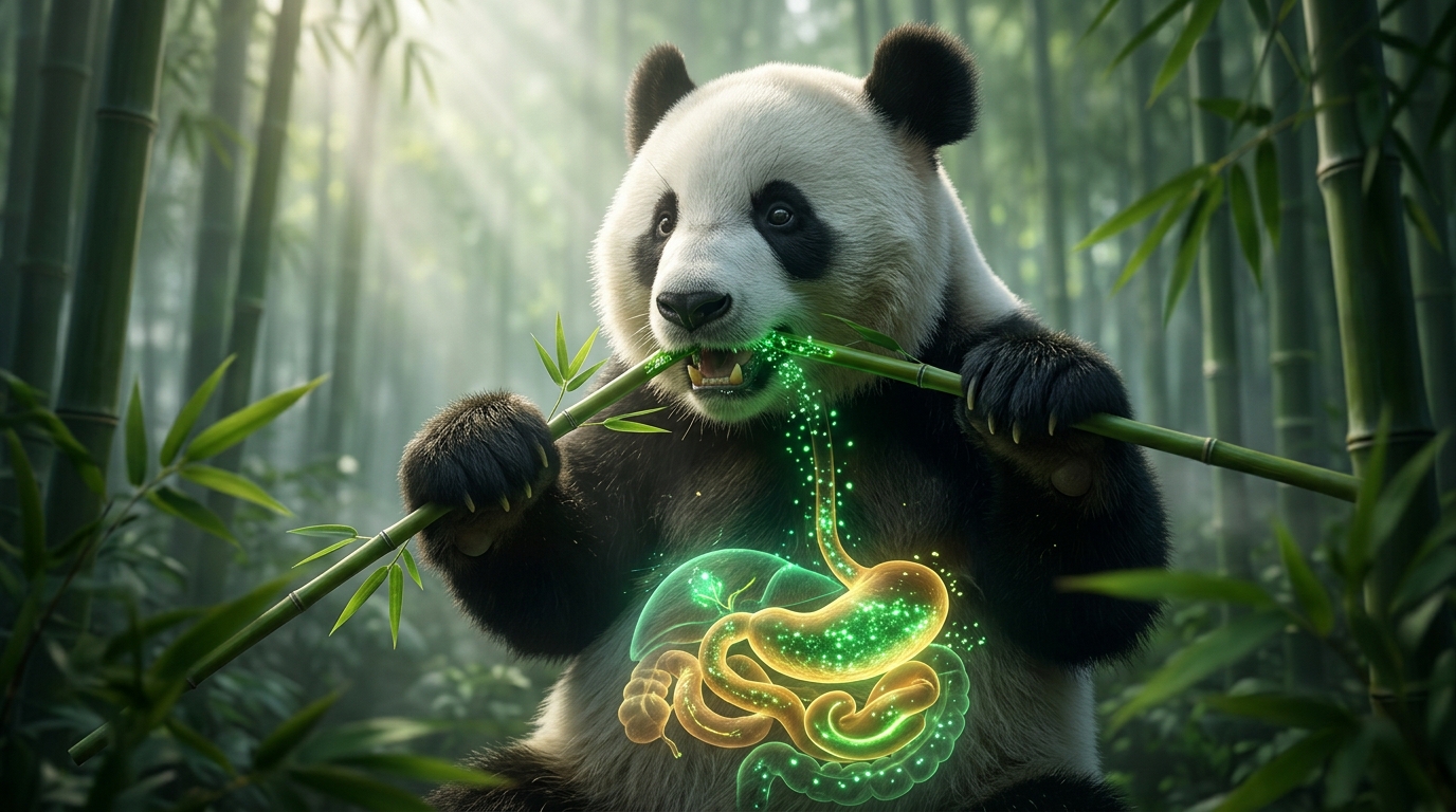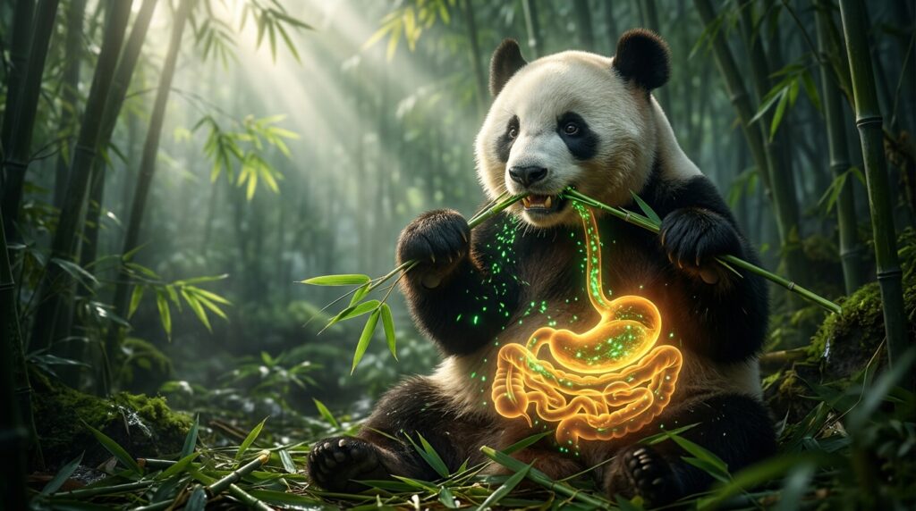 肉食動物型の短い腸を持ちながらパンダが竹を消化して生存できる最大の秘密が、腸内細菌(腸内フローラ)の存在です。