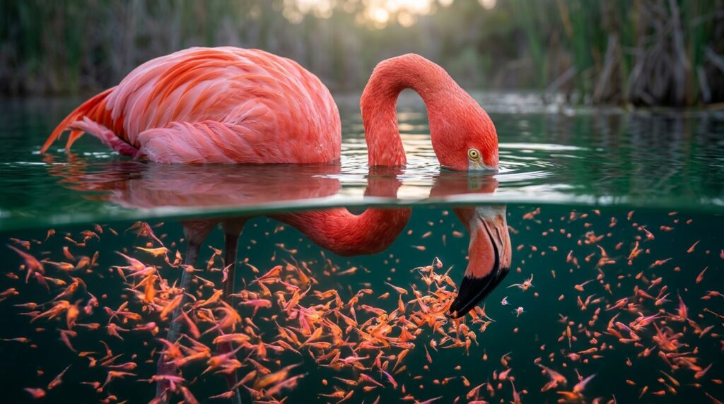 このエビや藻類にはカロテノイドと呼ばれる色素が豊富に含まれており、これがフラミンゴの体色を決定する根本的な原因です。フラミンゴのピンク色は、まさに「食べるものが体の色になる」という自然の仕組みそのものなのです。